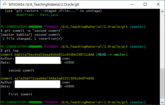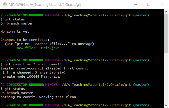 *Main.java 수정확인(1번째 코멘트) 및 추가(add) 후 상태확인 및 commit 및 첫번째멘트 추가