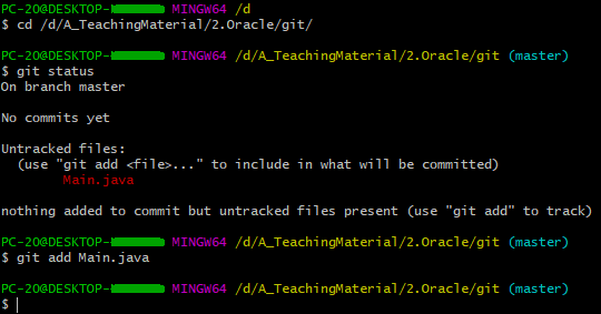 *Main.java 수정확인(1번째 코멘트) 및 추가(add) 후 상태확인 및 commit 및 첫번째멘트 추가