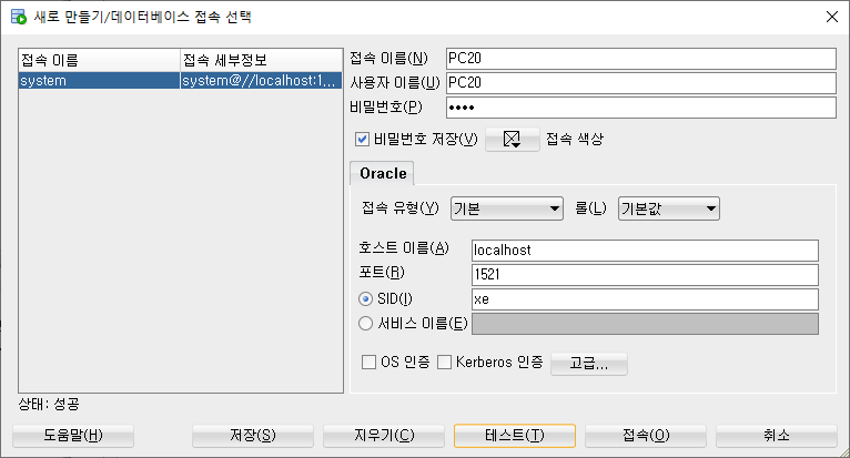 접속이름.사용자이름.비밀번호(java).저장체크.호스트.포트(1521).SID(버전xe).확인 후