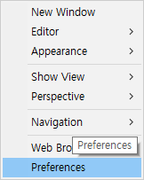 다시 이클립스 상단 메뉴에서 Window > Preferences