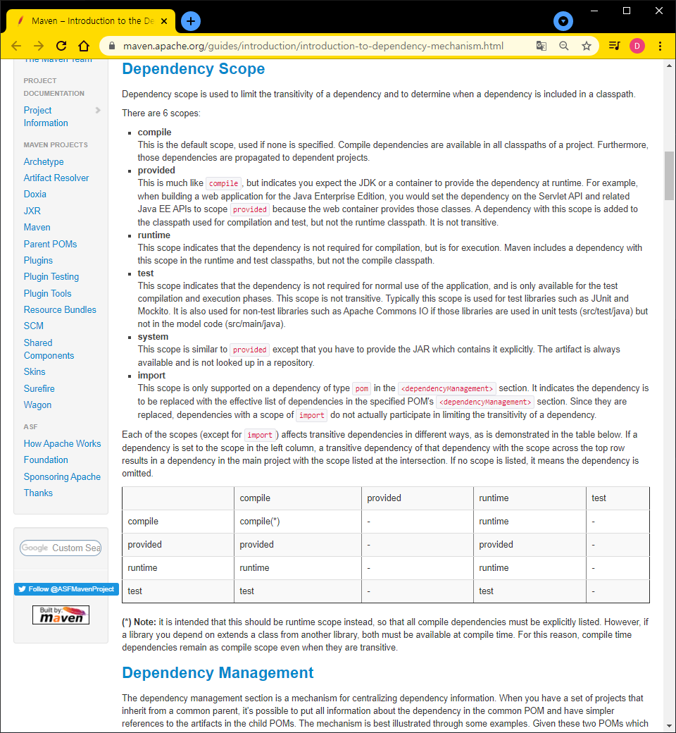 각 범위 (제외 import)는 아래 표에 나와있는 것처럼 다양한 방식으로 전이 종속성에 영향을줍니다. 종속성이 왼쪽 열의 범위로 설정된 경우 맨 위 행의 범위에 대한 해당 종속성의 전이 종속성은 교차점에 나열된 범위와 함께 주 프로젝트의 종속성이됩니다. 범위가 나열되지 않으면 종속성이 생략되었음을 의미합니다.