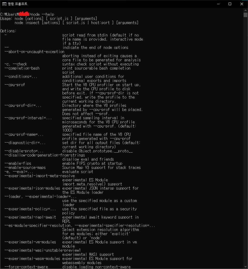 CMD 창에서 "node --help"라고 타이핑하면 안내. 도움말 텍스트를 볼 수 있다.
