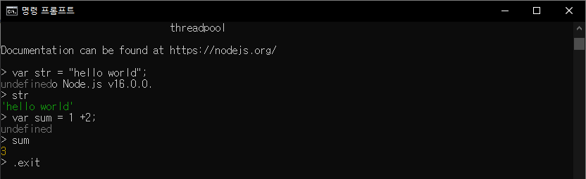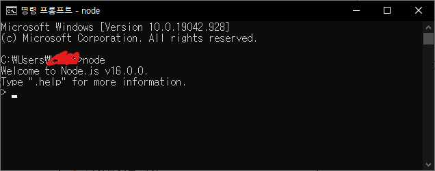 현재 윈도우에 node설치 후 CMD 창을 열어서 "node"라고 타이핑 후 엔터. 그러면 해당 버전이 확인 문구가 뜬다.. 완료!