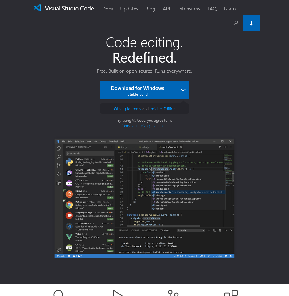 Visual Studio Code is a code editor redefined and optimized for building and debugging modern web and cloud applications. Visual Studio Code is free and available on your favorite platform - Linux, macOS, and Windows.