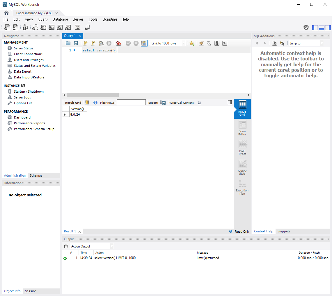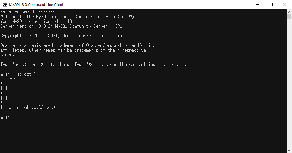 윈도우 시작메뉴 >> Command Line Client 실행 >> password 입력 >. select 1; 입력후 확인