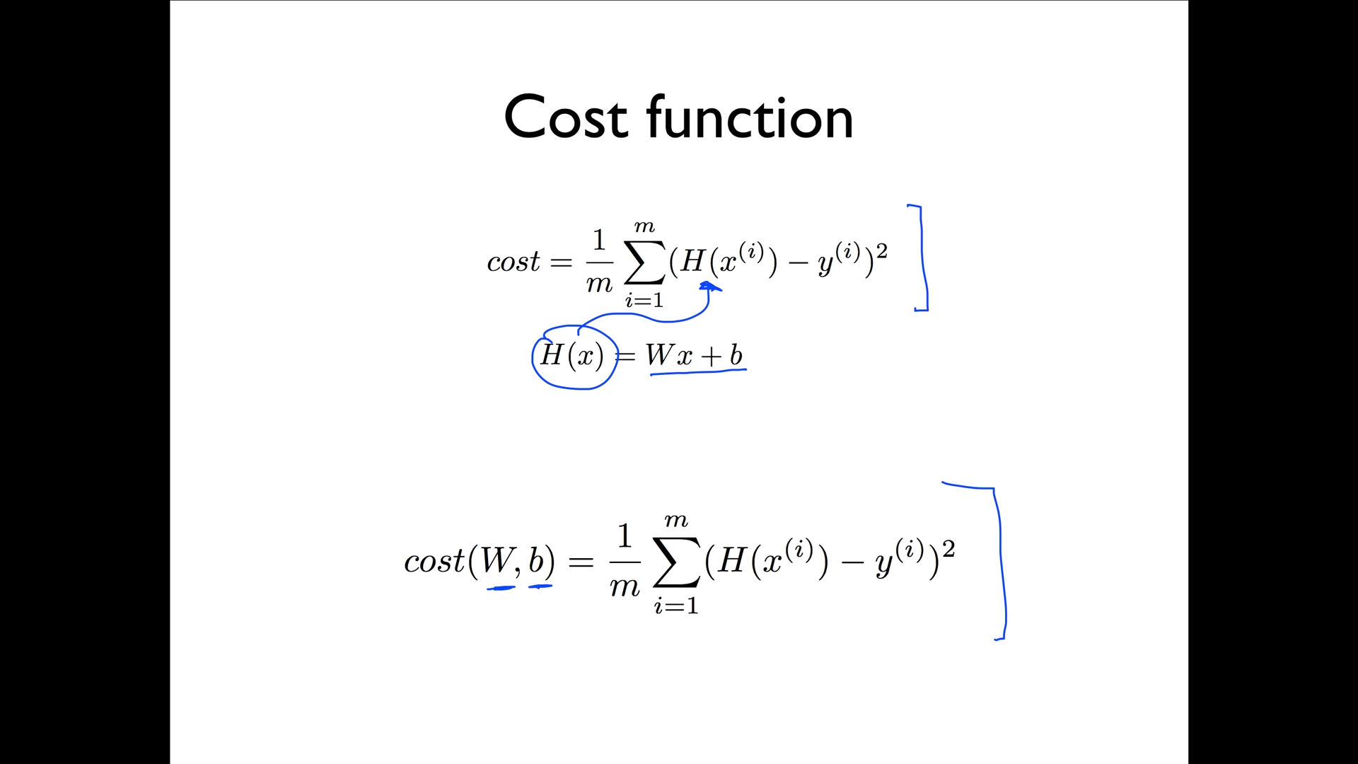 가설의 차이를 구하는 것; 제곱을 활용하여 일정한 차이를 양수, 차이를 확인 가능 = cost function