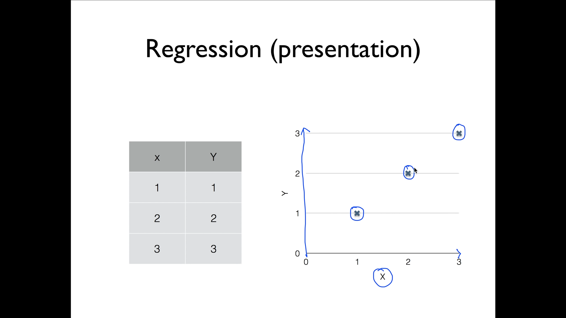 /두 변수 x와 y와의 관계에 적합한 선. 회귀선이라고도 한다. 회귀가 직선인 경우에는 회귀 직선이라고 한다.