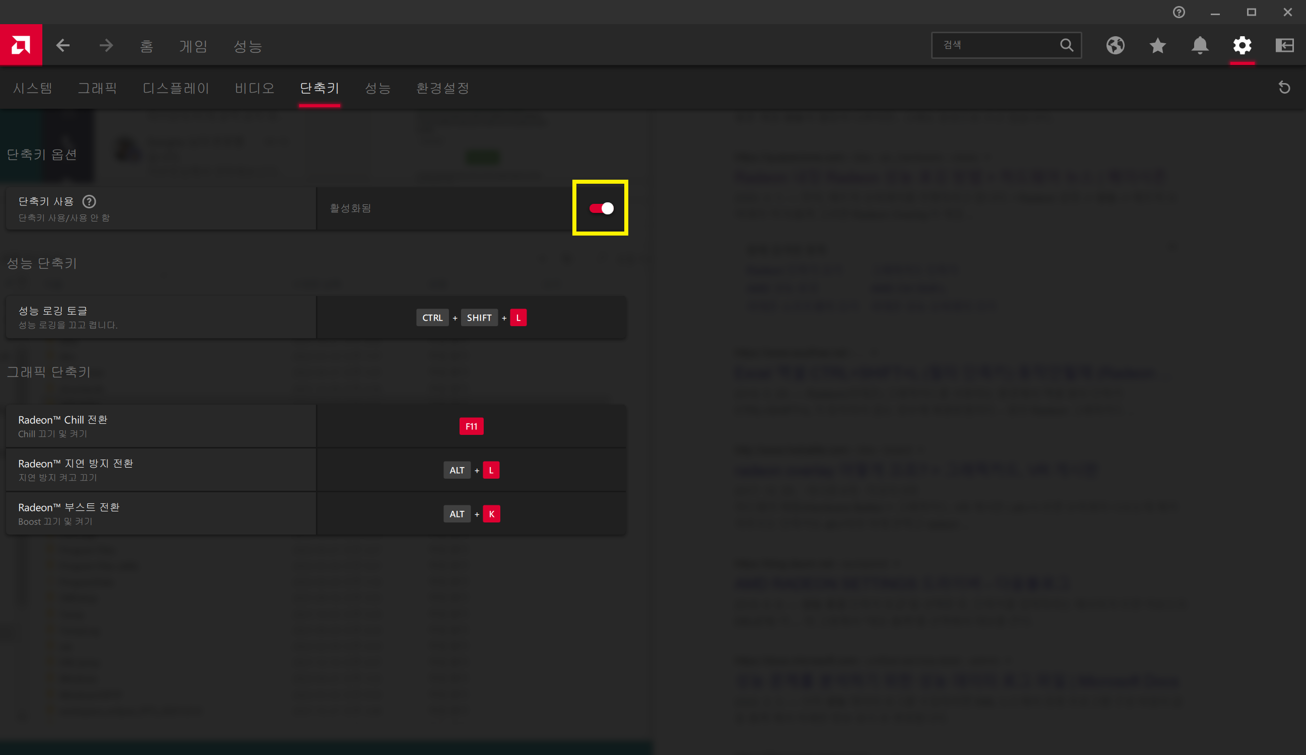 5. 그래픽카드 소프트웨어 설정창 내 단축키 탭을 확인한뒤 '단축키 사용' 항목 단추를 찾아 비활성화 합니다.